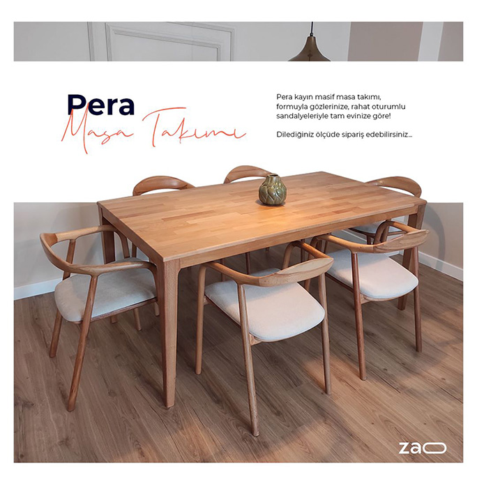 Görünüşü kadar konforunda çok önemli olduğu mobilyalardan olan masa takımları gözümüze de hitap etsin isteriz. Pera Masa Takımı, Nova Sandalyelerin eşlik etmesiyle modern bir forma kavuşuyor.
