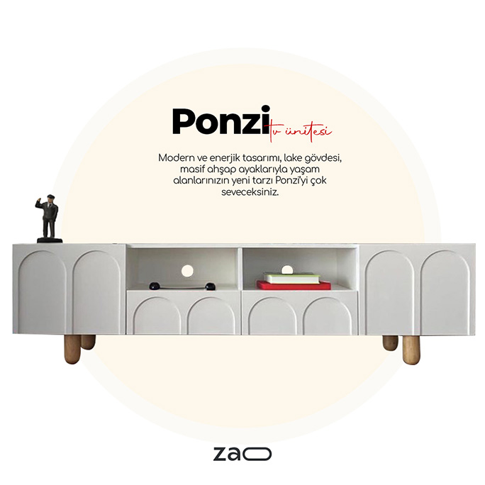 Modern ve enerjik tasarımı, lake gövdesi, masif ahşap ayaklarıyla yaşam alanlarınızın yeni tarzı Ponzi’yi çok seveceksiniz.